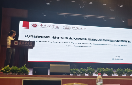 当日下午,陈璇博士以“从机制到药物:基于疟原虫入侵宿主细胞机制的新型抗疟药研发”为题,对在同济大学张青锋教授团队的研究成果作了专题学术报告。陈博士从疟疾防控的全球挑战出发,系统阐述了疟原虫入侵宿主细胞的分子机制,重点介绍了其团队在表观遗传调控领域的最新研究成果,并展示了基于新靶点的抗疟药物研发思路。报告内容深入浅出、逻辑严密,引发了与会师生的热烈讨论。张青锋教授在点评中指出,该研究不仅具有重要科学价值,更为疟疾防控提供了新的技术路径,鼓励团队继续深化研究,争取早日实现临床转化。